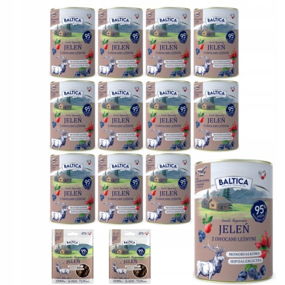 Karma mokra jeleń z owocami leśnymi 12x400g + 2 x smaczki półmiękkie Baltica 30g jeleń