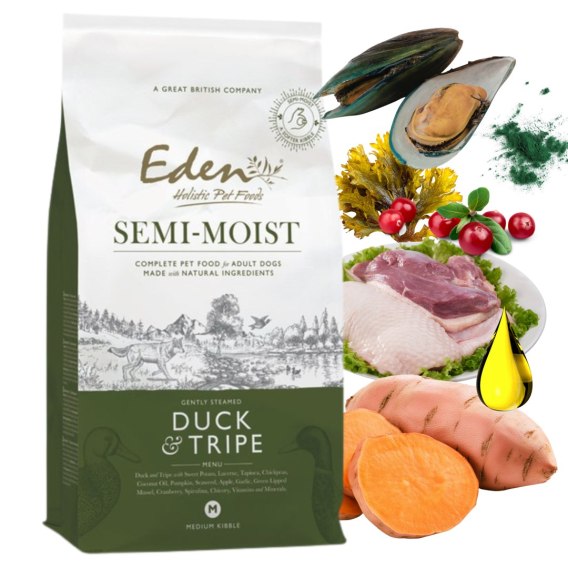 36% kaczka świeża, 18% kaczka suszona, batat, gliceryna roślinna, 4% żwacze świeże, lucerna, 2% wątróbka drobiowa (suszona), tapioka, ciecierzyca, olej kokosowy, dynia, błonnik grochowy, 0,07% algi morskie (DHA), jabłko, czosnek, małże zielone 0,07%, żurawina, spirulina, cykoria, 0,03% glukozamina, 0,03% MSM, 0,02% siarczan chondroityny.