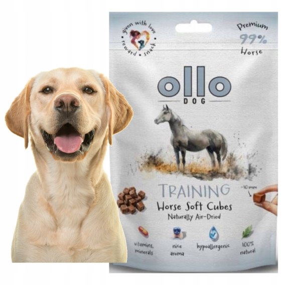 - AIR-DRIED TRAINING SOFT CUBES KONINA 80gPrzysmaki dla psa Ollo Air-Dried Training Horse Soft Cubes to naturalne, hipoalergiczne, monobiałkowe smaczki z koniny. Są delikatnie suszone powietrzem. W kształcie kostek o wymiarach ok 10 mm. W 100% naturalny produkt, stworzony z myślą o psach wszystkich ras i w każdym wieku. Są miękkie i monobiałkowe, co jest niezwykle istotne dla psów z alergiami pokarmowymi oraz tych z wrażliwym żołądkiem.