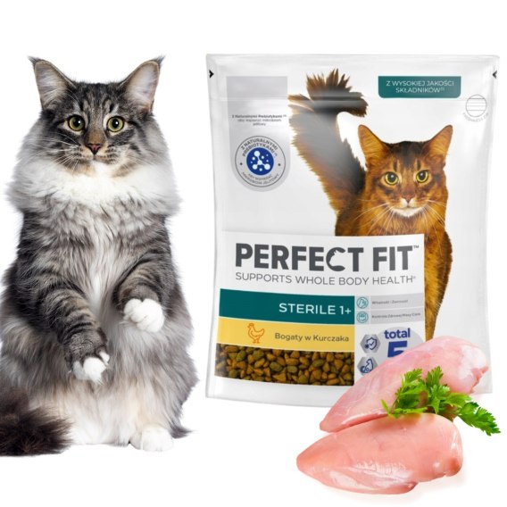 Perfect Fit Sterile 1+ z kurczakiem to pełnoporcjowa sucha karma stworzona specjalnie z myślą o potrzebach kotów po sterylizacji. Zbilansowany skład pomaga utrzymać prawidłową wagę oraz wspiera zdrowie układu moczowego, co jest szczególnie istotne u dorosłych kotów po zabiegu sterylizacji lub kastracji.