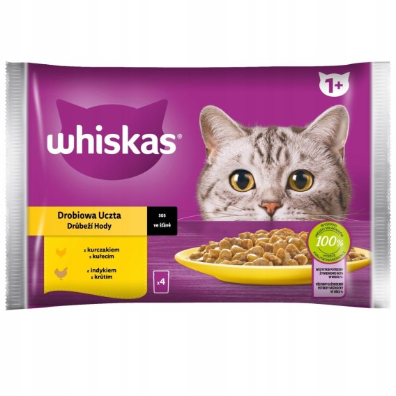 WHISKAS saszetka 4 x 85 g Drobiowa Uczta - mokra karma pełnoporcjowa dla dorosłych kotów, w sosie (kawałki z: kurczakiem, indykiem)